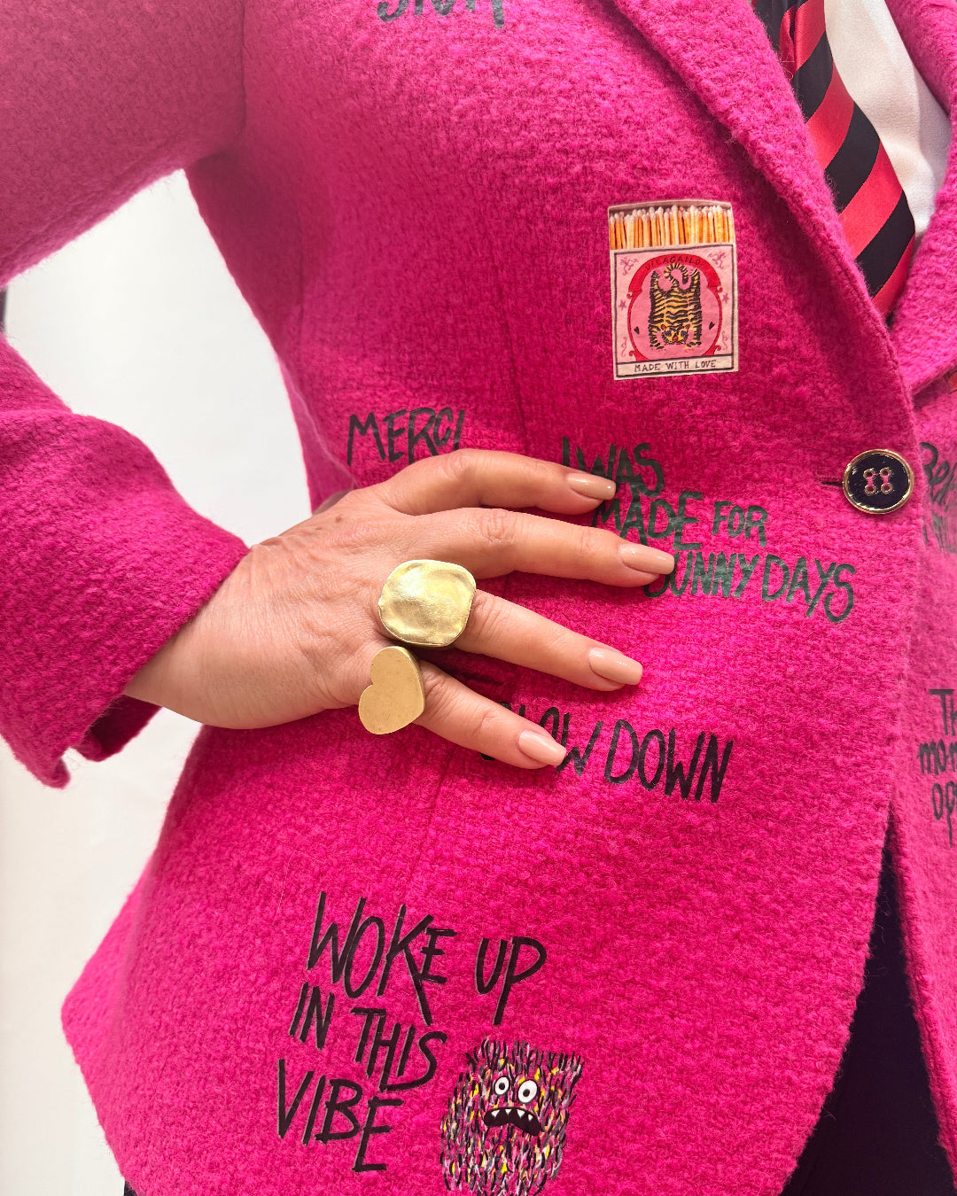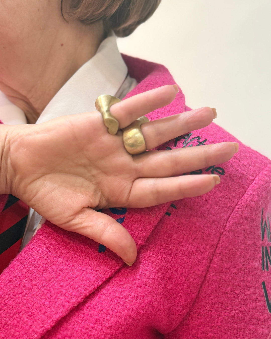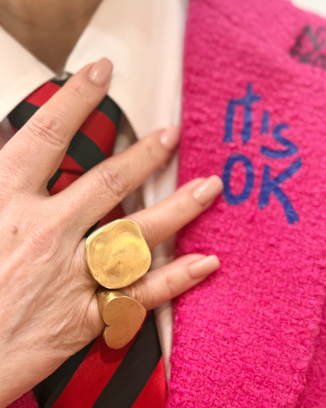 Double heart ring, large, bold, eccentric! At the top, a large heart you show to the world, then underneath, a second heart - hidden in the inside of the hand and meant for the wearer - to remind yourself to carry love with you and to love yourself.